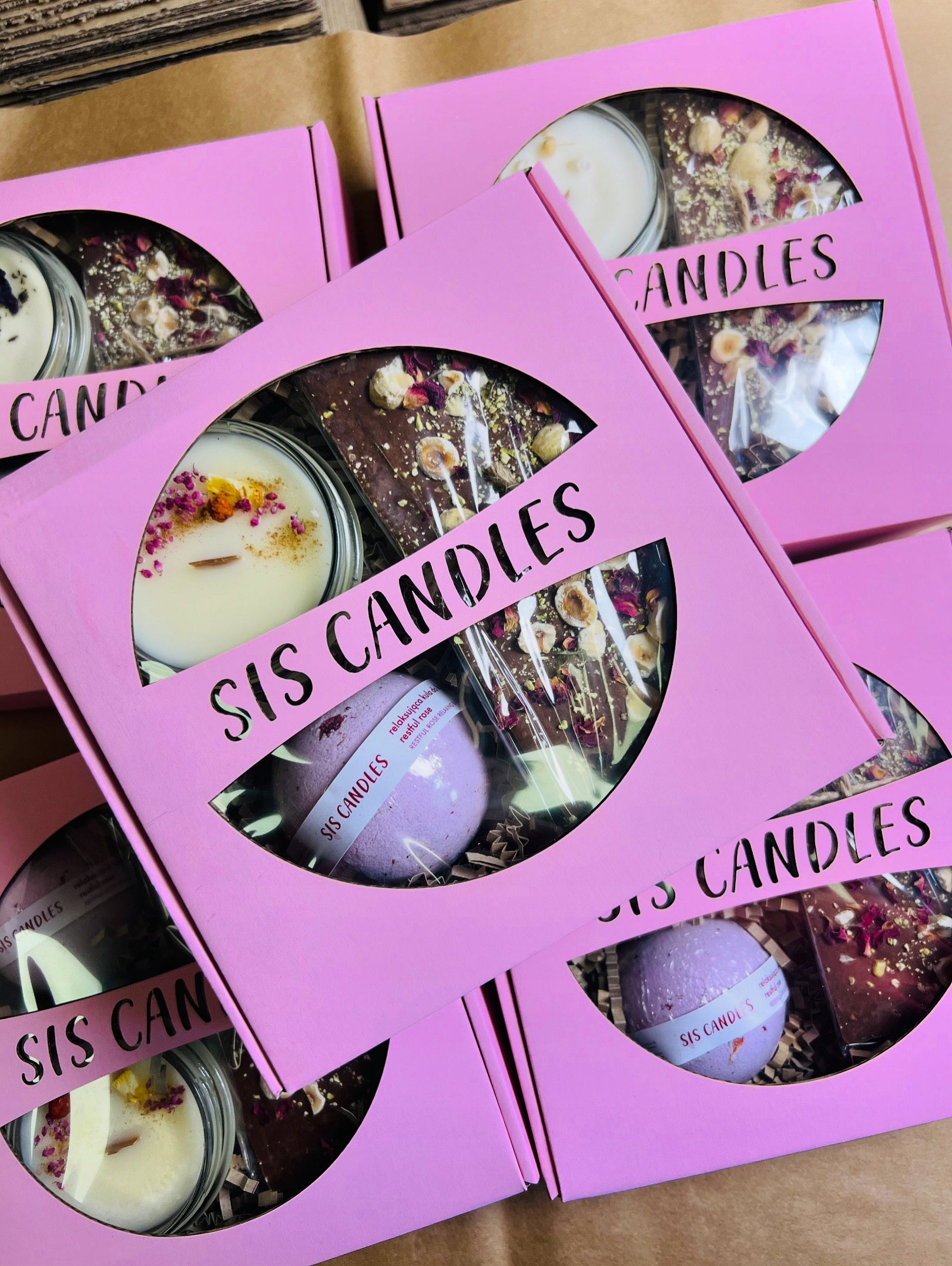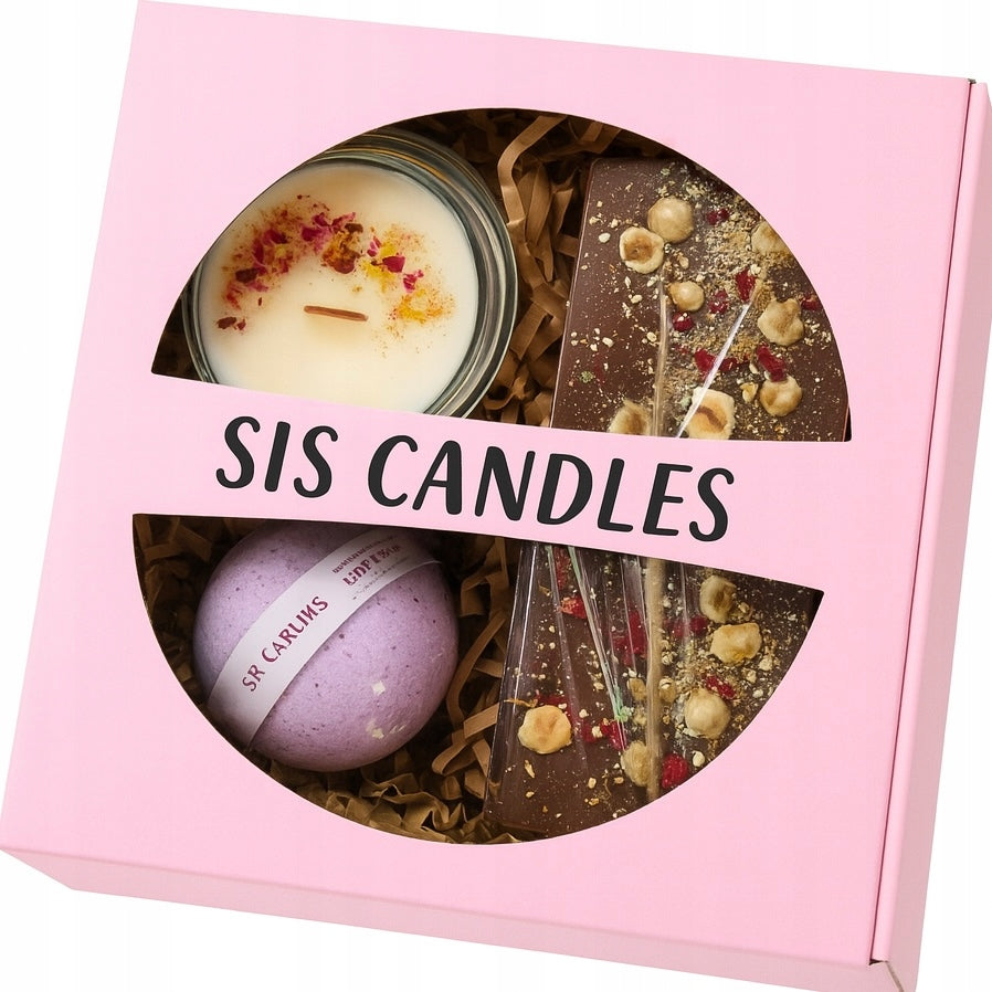 Dovanų rinkinys SisCandles - sojų vaško žvakė, vonios bomba, šokoladas