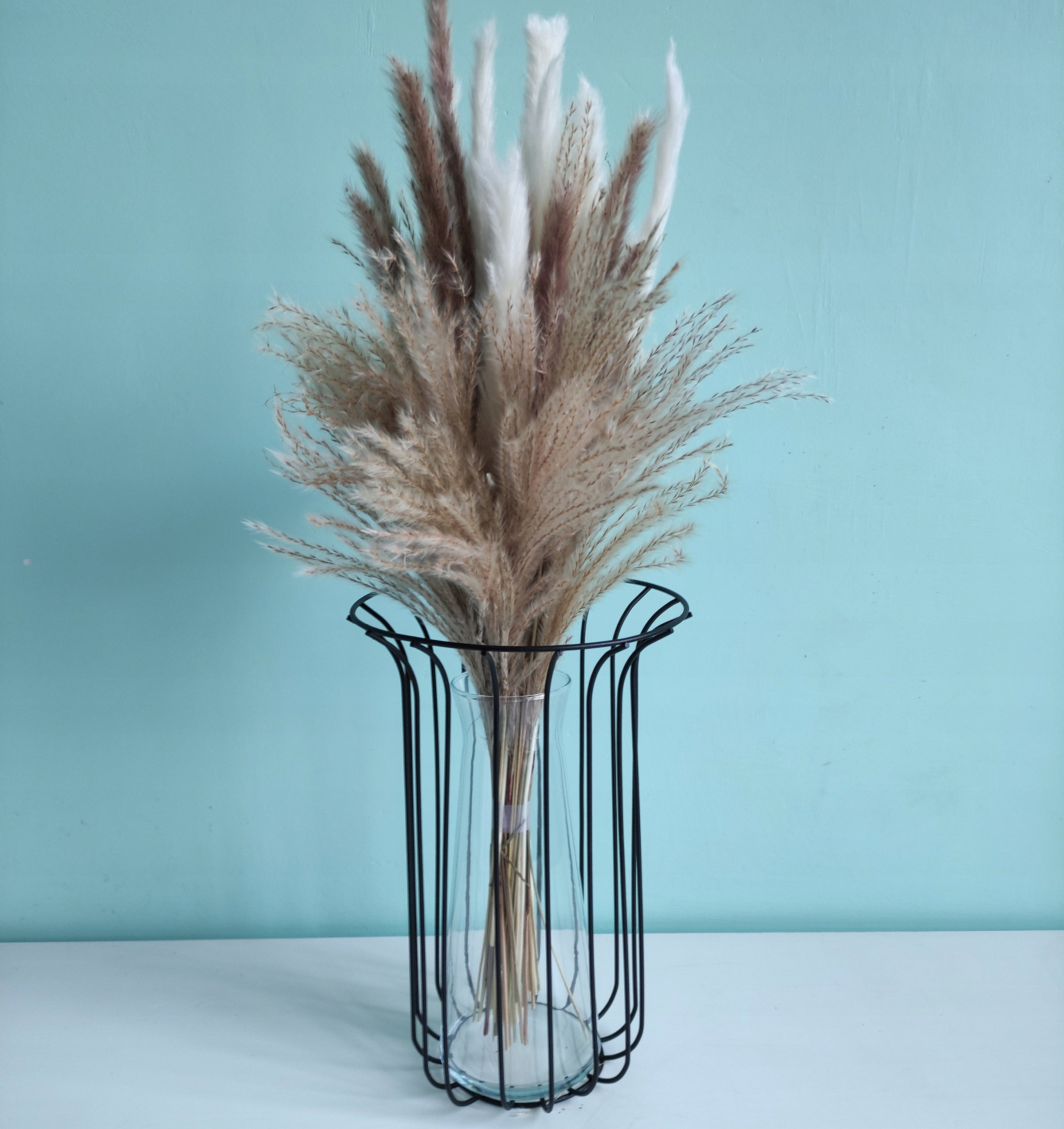 Ši ažurinė vielos vaza yra pagaminta iš patvaraus metalo, padengto milteliniais dažais, užtikrinančiais ilgalaikį grožį ir atsparumą įbrėžimams. Jos aukštis yra 30 cm, o plačiausia vieta siekia 20 cm skersmenį. Juoda spalva suteikia jai elegancijos ir universalumo, leidžiančios lengvai derinti su įvairiais namų dekoro elementais. Tai puikus pasirinkimas tiems, kurie vertina originalumą ir siekia sukurti išskirtinę atmosferą savo gyvenamojoje erdvėje. Puikiai tinka su džiovintomis gėlėmis, pavyzdžiui, pampų žole, arba gali būti naudojama kaip stilingas žibintas įdėjus arbatinę žvakutę.