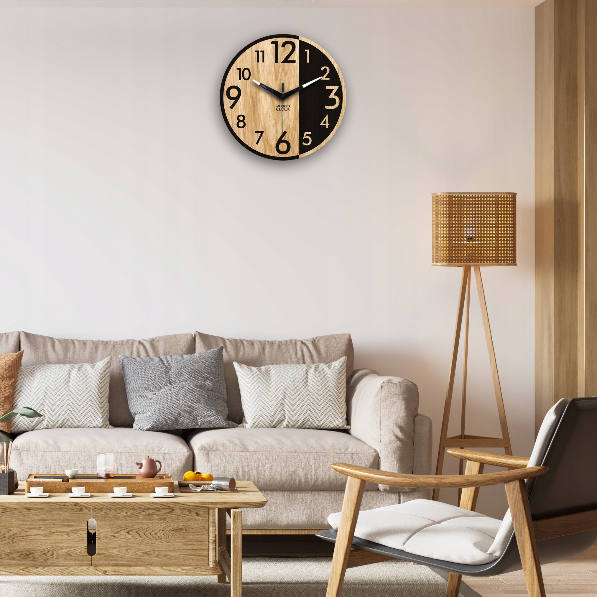 • Aiškiai įskaitomi juodi skaitmenys ir rodyklės ant natūralaus medžio fono.